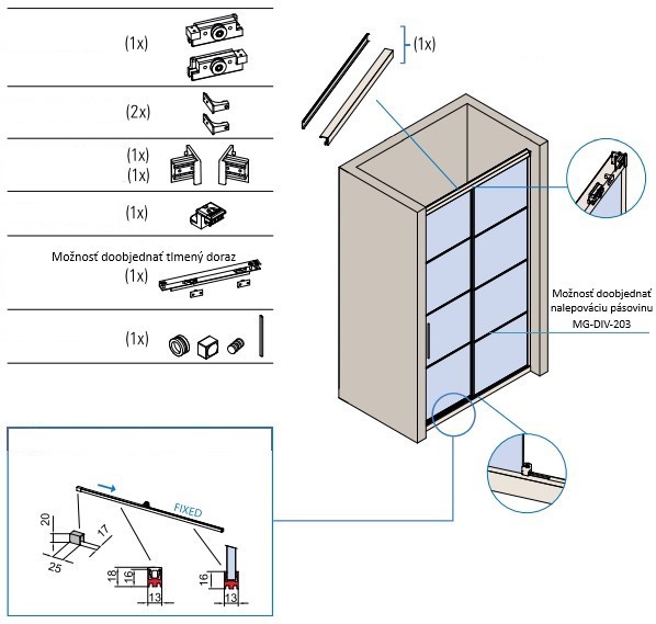 Set kování v rámu do niky pro 1x fixně a 1x posuvně křídlo, bez tlumeného dorazu, Set je bez tlumeného dovírání a nalepovací designové pásoviny (lze to doobjednat),