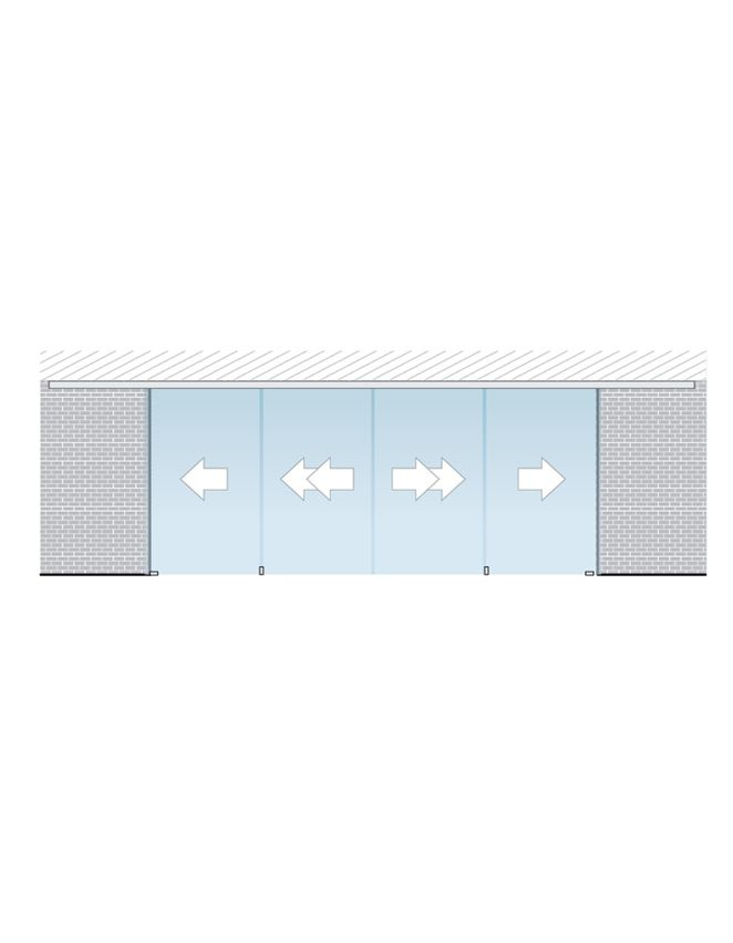 Pro 4 dveřní křídla:, 8x Systém tlumeného dovírání, , 2x Vodící kolejnice pro montáž na strop, , 3x Krycí profil, , 4x Podlahové vodítko a sběrače, , 4x Sada vozíků a příslušenství, , 1x Sada pro uchycení fixního dílu,